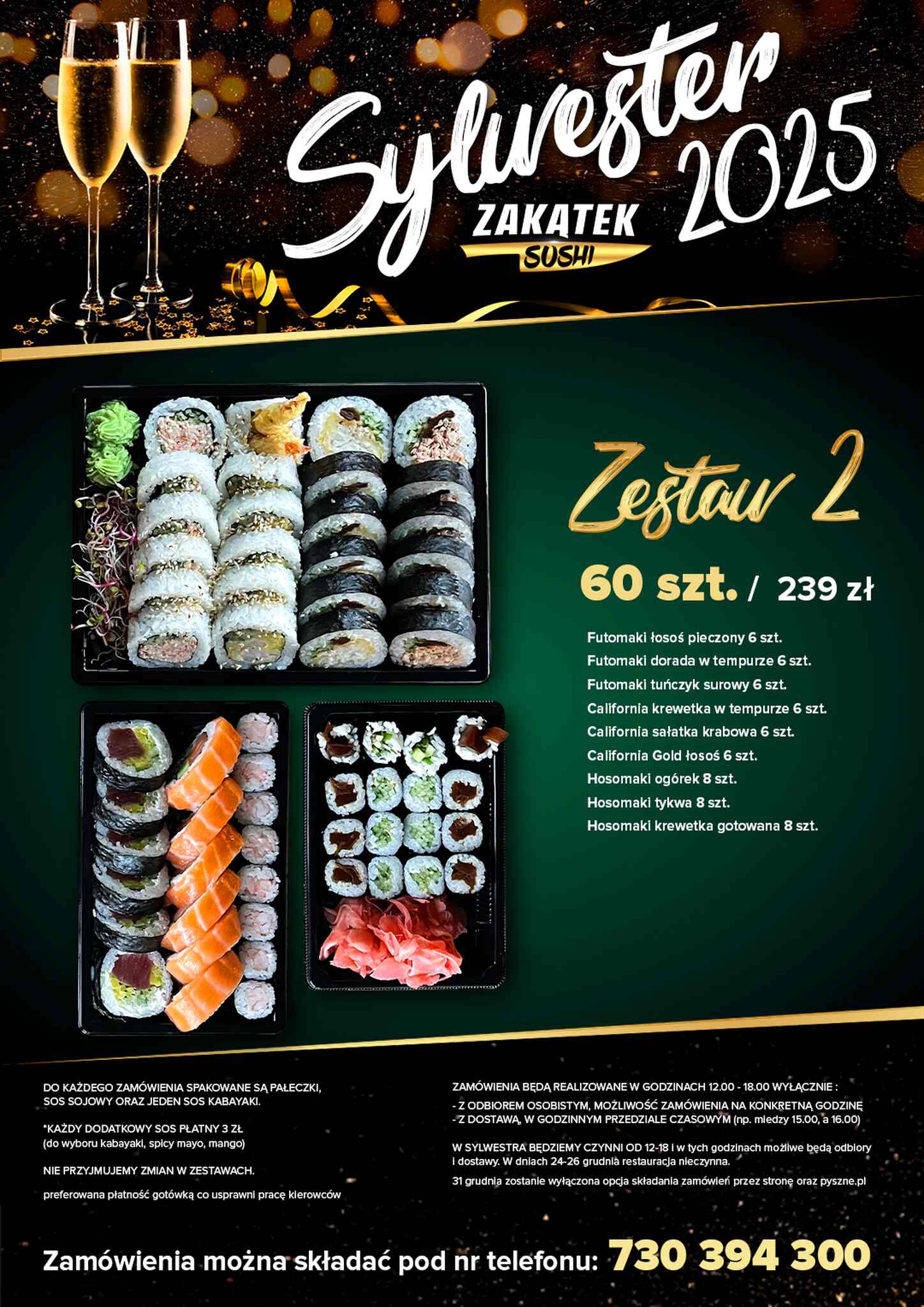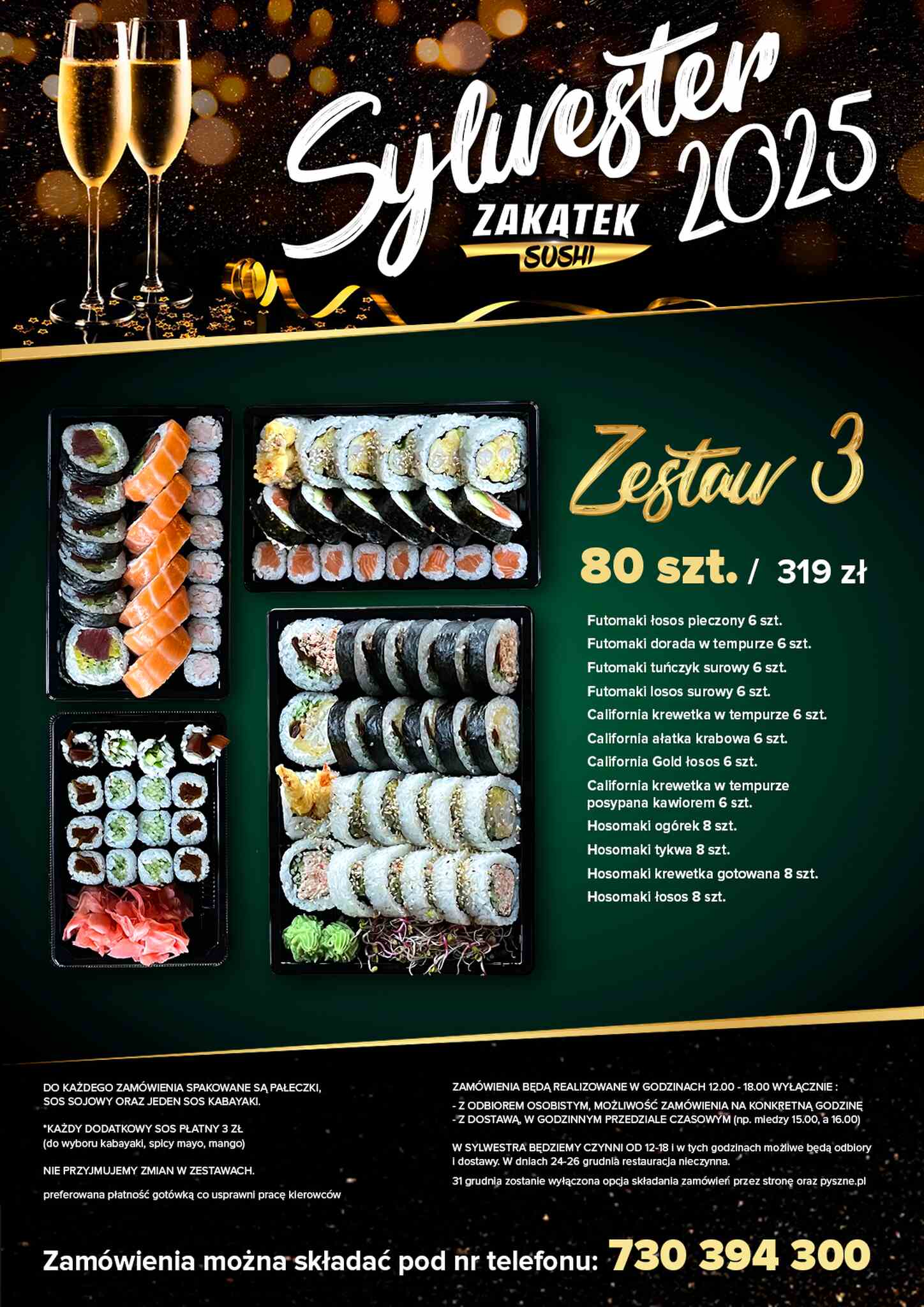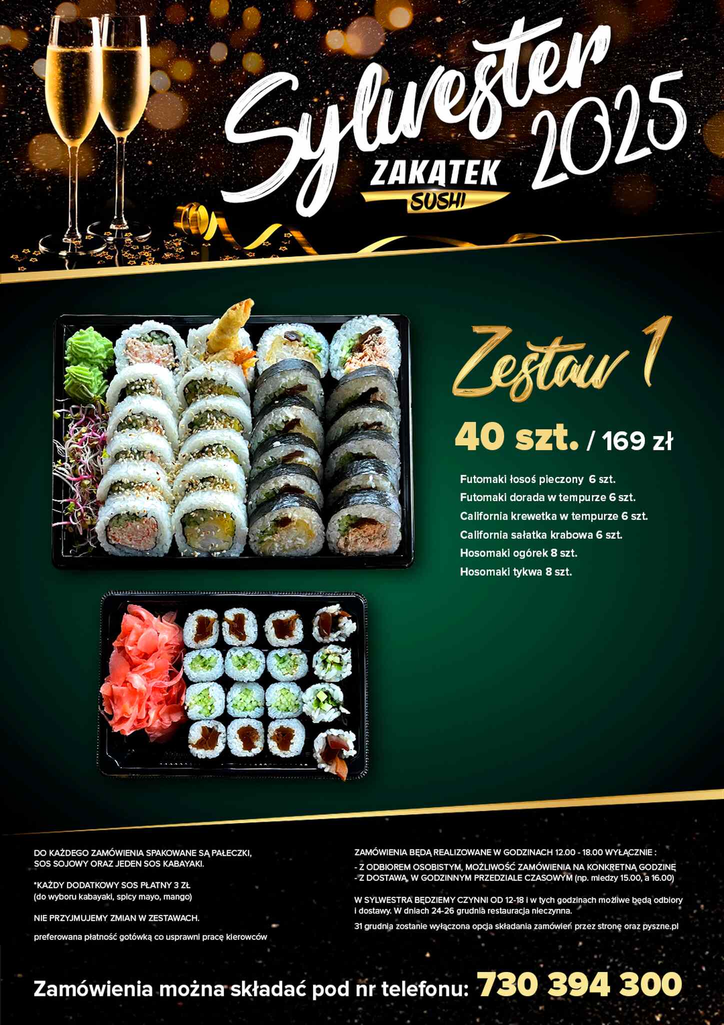 W dniach 24-26 grudnia restauracja nieczynna. W okresie 27-30 restauracja jest czynna i przyjmujemy zamówienia wyłącznie telefonicznie. Dnia 31 w sylwestra mamy czynne do godziny 18.00 i w tym dniu można zamawiać tylko zestawy sylwestrowe. 1 stycznia-Nowy Rok nieczynne .
